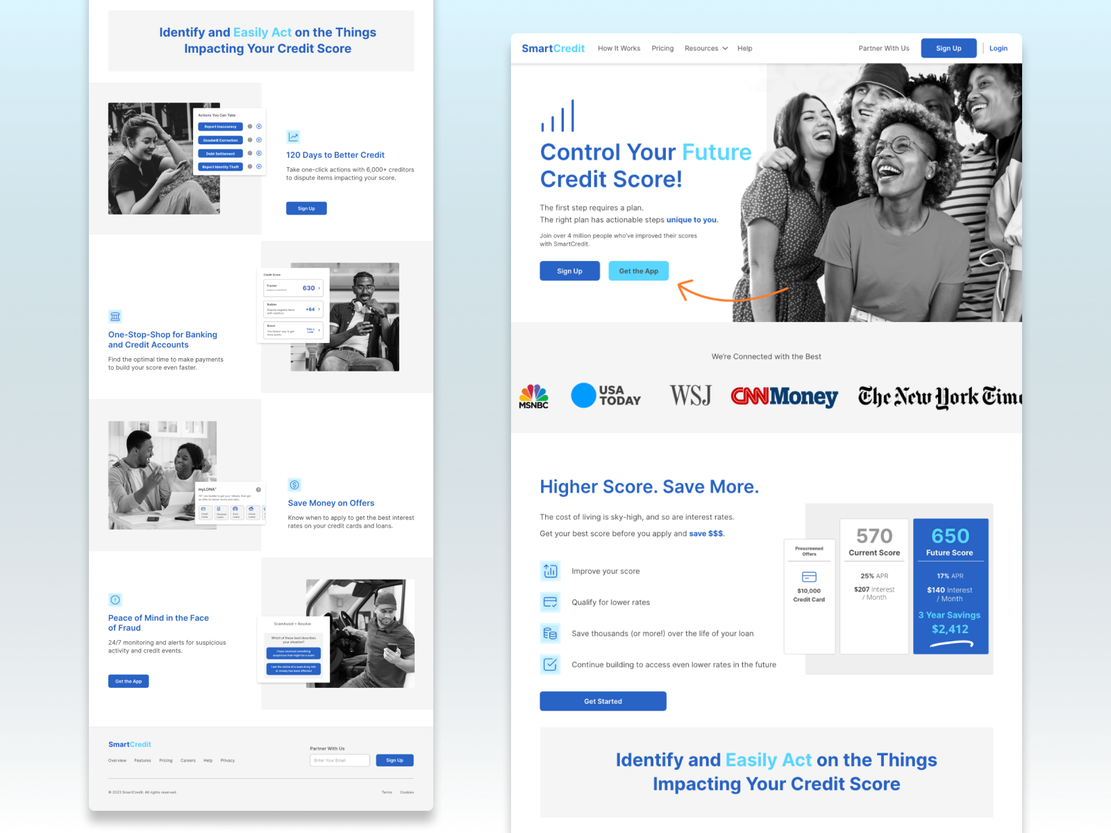 SmartCredit is a FinTech SaaS platform operating at the intersection of consumer finance, credit education, and digital tools. As the product and brand matured, key user entry points needed to better support clarity, trust, and conversion. This initiative focused on redesigning SmartCredit’s signup and reactivation flows, alongside a proposed marketing landing page redesign, to reduce friction across acquisition and onboarding while extending the refreshed brand system into a cohesive, mobile-first product experience.
